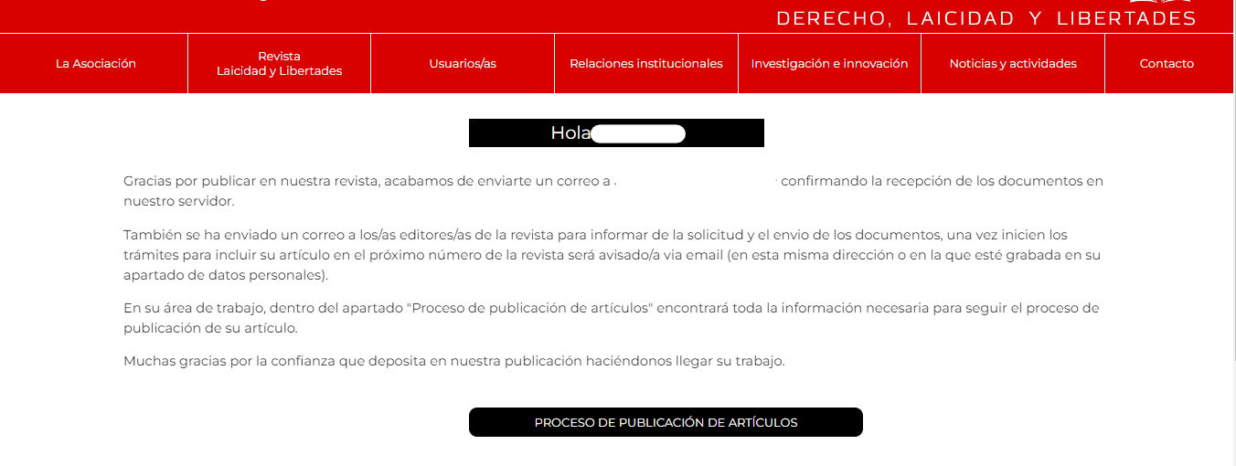 Una vez realizados todos los pasos anteriores, se nos mostrará una pantalla con la información necesaria para poder seguir todo el proceso que se realizará hasta la publicación del artículo, se enviará un email a la dirección con la que la persona esta registrada informando de la correcta recepción de la solicitud de publicación del artículo.