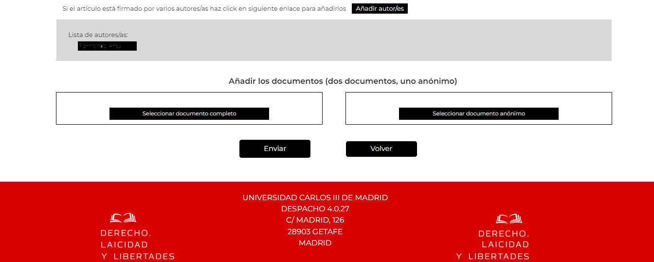 Por último hay que incluir dos documentos, uno de ellos sin metadatos y sin datos que puedan identificar al autor/a, que serán enviados a los gestores/as para que inicien el proceso de publicación, remitiendo las personas seleccionada para realizar la evaluación sólo el documento anónimo (documento sin metadatos y sin datos que puedan identificar al autor/a).