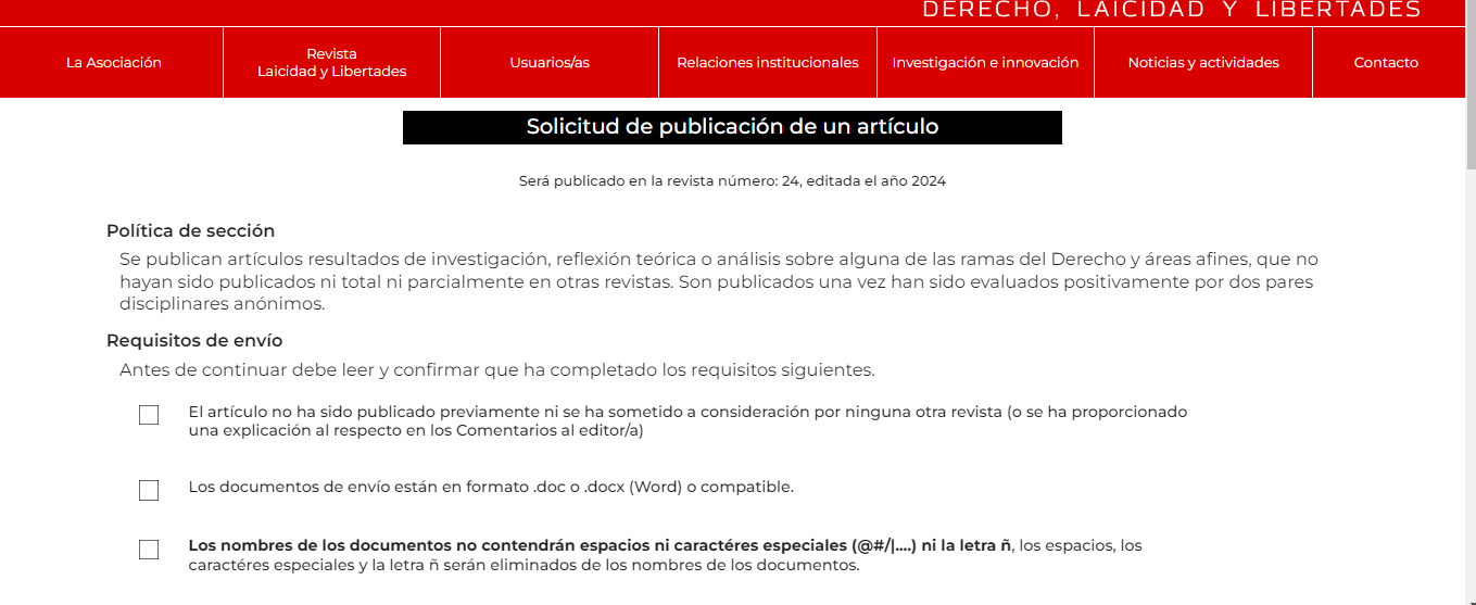 Para publicar en la revista "Laicidad y libertades. Escritos jurídicos" debes registrarte en esta web (lo puedes hacer haciendo clic en el siguiente enlace: Registrarse en la web).