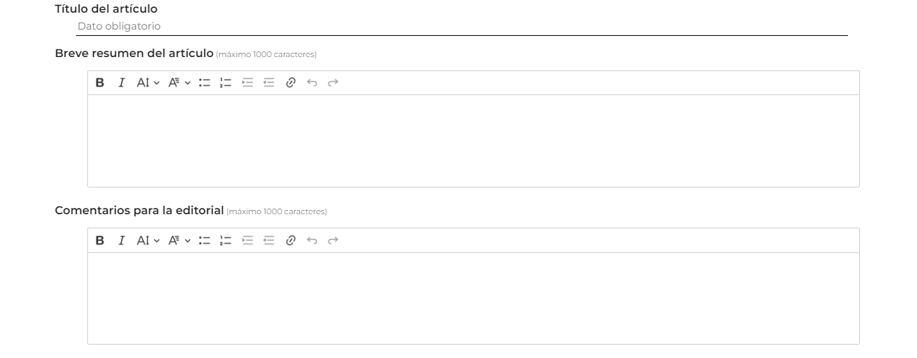 A continuación se solicita el nombre del artículo (dato obligatorio), asi como un breve resumen del mismo y si se desea, se puede introducir un breve comentario para el editor/a de la revista (estos datos son opcionales).